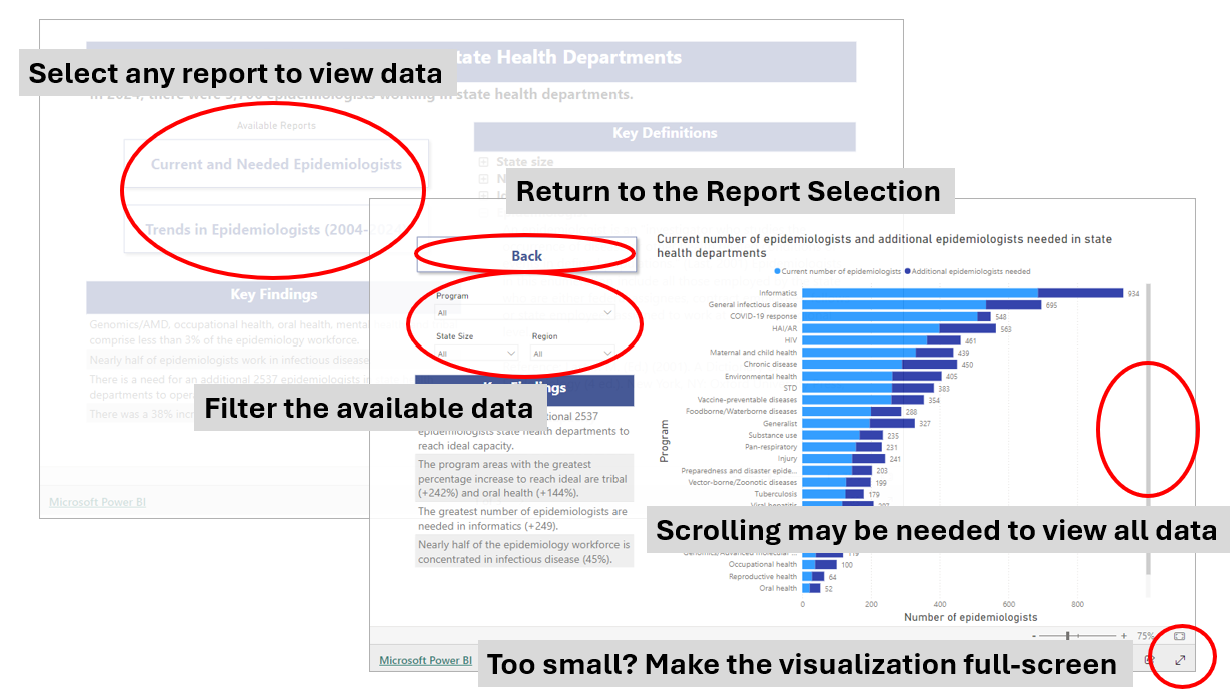 The following dashboards include current and historical ECA data for key metrics, including current and needed epidemiologists, funding sources, ability to deliver the Essential Public Health Services (EPHS) and salary data. Data may be displayed nationally or stratified by region, state size or program area. Individual state level data is not available.